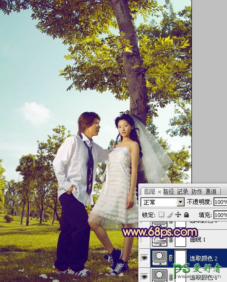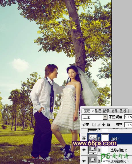 PS照片后期调色教程,photoshop调出流行的黄色效果树林情侣写真照,素材图片绿色比较多,不过层次感不够强。处理的时候可以适当把高光部分的绿色转为橙黄色,再给暗部增加一些暗褐色,这样可以更好增加图片的空间感。 最终效果 原图 1、打开
