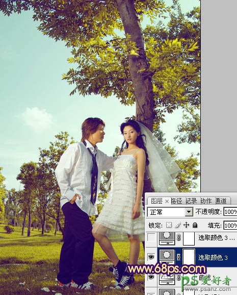 PS照片后期调色教程,photoshop调出流行的黄色效果树林情侣写真照,素材图片绿色比较多,不过层次感不够强。处理的时候可以适当把高光部分的绿色转为橙黄色,再给暗部增加一些暗褐色,这样可以更好增加图片的空间感。 最终效果 原图 1、打开