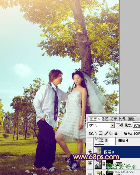 10、新建一个图层,盖印图层,执行:滤镜 > 模糊 > 动感模糊,角度设置为-45度,距离设置为150。确定后把图层混合模式改为“柔光”,不透明度改为:20%。效果如下图。