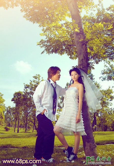PS照片后期调色教程,photoshop调出流行的黄色效果树林情侣写真照,素材图片绿色比较多,不过层次感不够强。处理的时候可以适当把高光部分的绿色转为橙黄色,再给暗部增加一些暗褐色,这样可以更好增加图片的空间感。