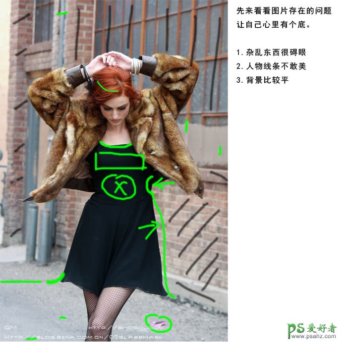 2、先来看看图片存在的问题:杂乱东西很碍眼,人物线条不够美,背景比较平。