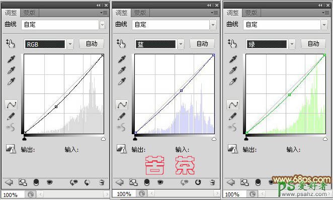 6、创建曲线调整图层,对RGB、绿、蓝色进行调整,参数设置。这一步降低点亮度。