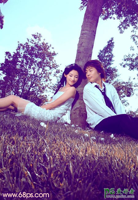 PS美女照片调色实例教程,photoshop给浪漫的情侣写真照调出个性紫色效果,素材图片色调有点单一,同时人物部分有点偏暗。处理的时候可以把图片暗部及高光部分颜色反差加大,这样可以丰富图片颜色。后期再把人物部分单独提亮及润色即可。