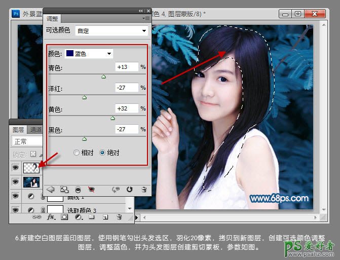 6、新建空白图层盖印图层,使用钢笔勾出头发选区,羽化20像素,拷贝到新图层。创建可选颜色调整图层,调整蓝色,并为头发图层创建剪贴蒙版,参数设置如下图。