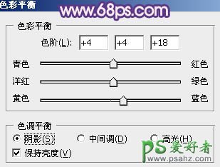 4、创建色彩平衡调整图层,对阴影、中间调、高光进行调整,参数设置如图13 - 15,效果如图16。这一步给图片增加蓝色和红色。