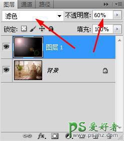 2、将图层的混合模式设置为“滤色”,不透明度设置为60%。