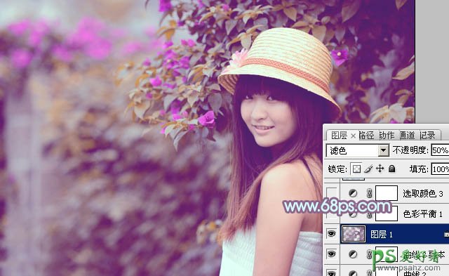 6、按Ctrl + Alt + 2 调出高光选区,按Ctrl + Shift + I 反选,新建一个图层填充暗紫色:#754679,混合模式改为“滤色”,不透明度改为:50%,效果如下图。这一步给暗部增加紫色和亮度。
