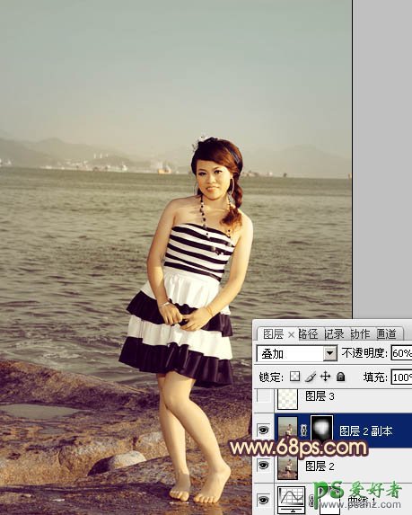 6、新建一个图层,盖印图层,混合模式改为“叠加”,不透明度改为:60%。按住Alt键添加图层蒙版,用白色画笔把人物头像及附近部分擦出来,效果如下图。这一步增加图片的高光区域。