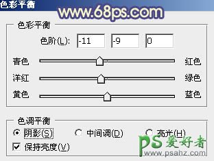 3、创建色彩平衡调整图层,对阴影,高光进行调整,参数设置如图6,7,效果如图8。这一步增加图片暗部及高光部分的橙黄色。