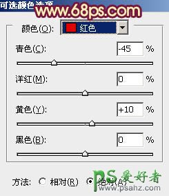 5、再创建可选颜色调整图层,对红,黄进行调整,参数设置如图11,12,效果如图13。这一步主要把人物的肤色调红润。