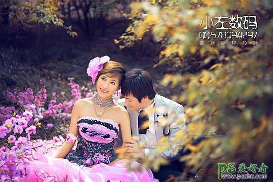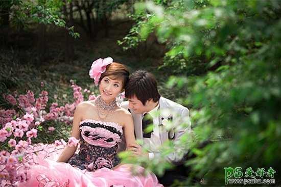 PS婚片后期调色实例教程,PS调出漂亮的暖色系树林情侣婚纱艺术照,色相/饱和度调色是非常快捷的,不过调色后图片也容易偏色。使用的时候可以先调出想要的主色,然后再慢慢校正一些偏色,就可以快速得到想要的效果。