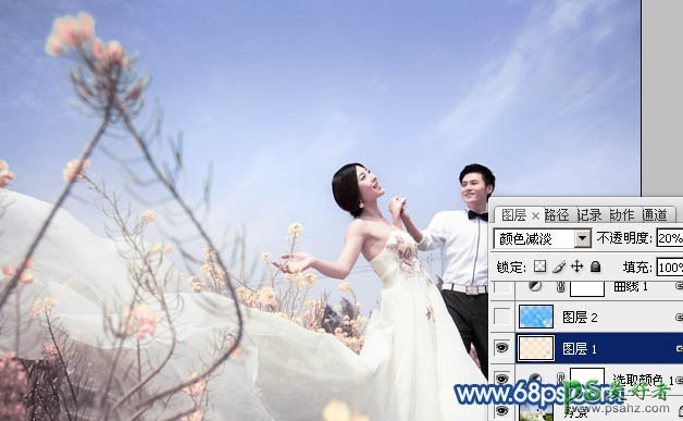 2、按Ctrl + Alt + Shift + 2 调出高光选区,新建一个图层填充淡黄色:#FFEBD2,混合模式改为“颜色减淡”,不透明度改为:20%,效果如下图。这一步给图片的高光部分增加暖色。