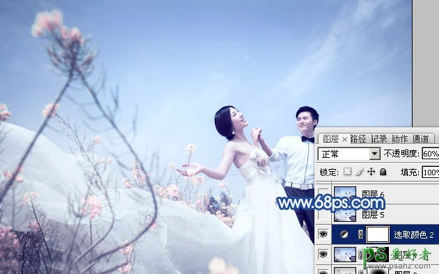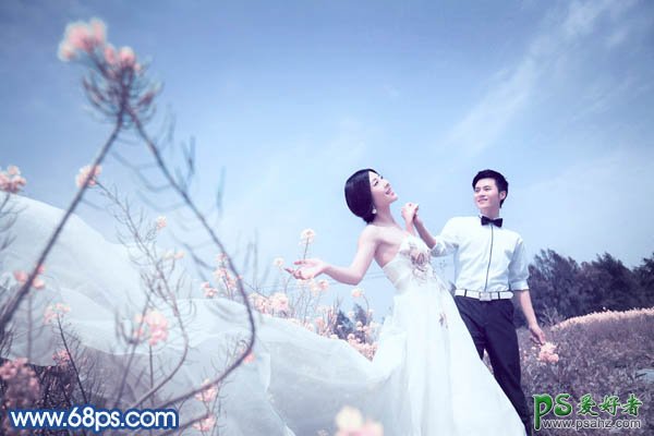 photoshop调出淡蓝色原野浪漫情侣婚纱艺术照
