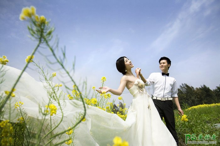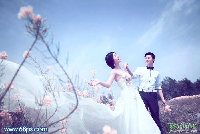 PS婚片后期调色教程实例,photoshop调出淡蓝色原野浪漫情侣婚纱艺术照,淡蓝色图片调色相对比较容易。可以先调出蓝色的基调,然后把图片的高光调亮,做出淡色效果。后期简单美化人物,增加一些暗部和高光即可。