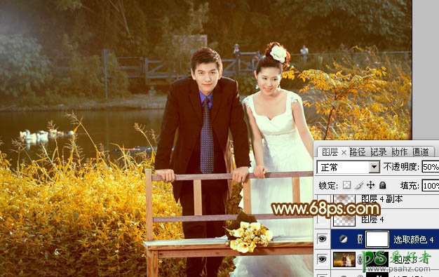 PS调色教程:给水景情侣婚纱照调出暖橙色效果