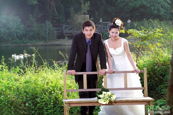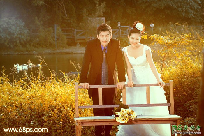 PS婚片后期调色实例教程,PS调色教程:给水景情侣婚纱照调出暖橙色效果,橙褐色有点类似朝霞色,图片调色中应用比较广泛,调色过程也比较简单。根据素材图片的颜色构成,用调色工具逐步增加橙色。再给图片暗部增加一些红褐色,高光部分增加淡黄色即可。