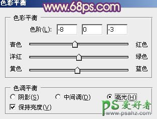 3、创建色彩平衡调整图层,对阴影,高光进行调整,参数设置如图11,12,效果如图13。这一步增加高光部分的淡青色。