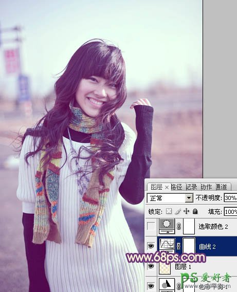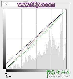 5、创建曲线调整图层,对RGB、绿、蓝进行微调,参数设置如图15,确定后把图层不透明度改为:30%,效果如图16。这一步给图片增加淡紫色。