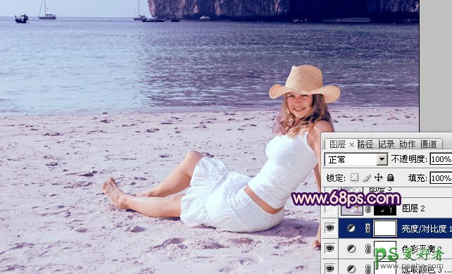 PS调色教程:给海滩上的欧美少女图片调出唯美霞光色