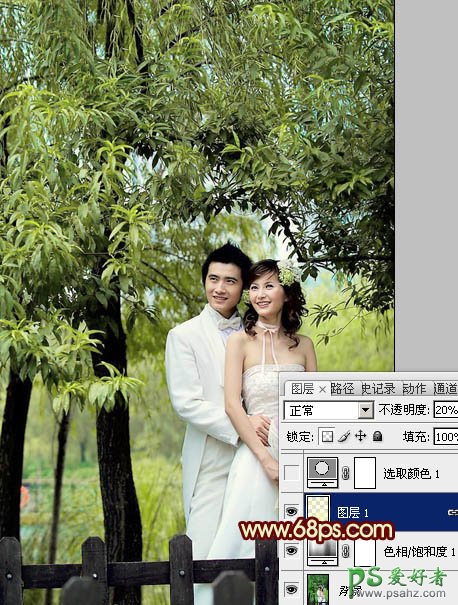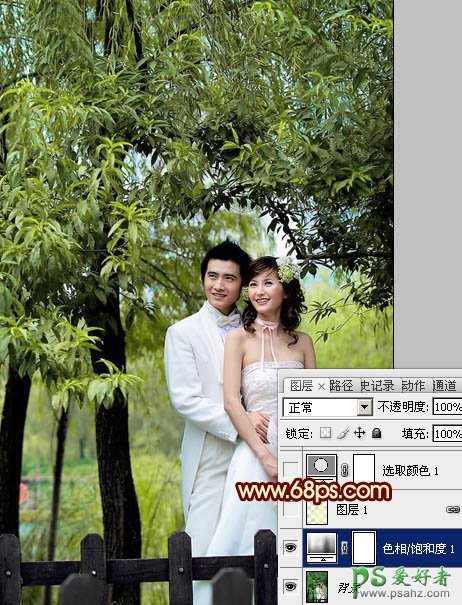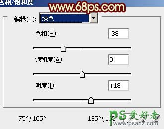 1、打开素材图片,创建色相/饱和度调整图层,选择绿色,用吸管吸取树叶颜色再调整,参数设置如图1,效果如图2。这一步把绿色转为黄绿色。