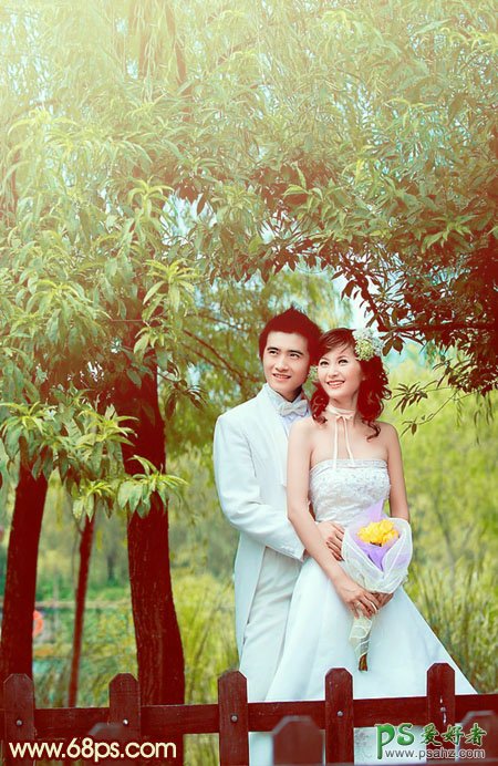 PS婚片调色实例教程,photoshop调出甜美青色效果树林情侣婚纱写真照,素材图片背景为纯绿色有点单一。需要增加一些补色及高光等来丰富画面。处理的时候可以把较亮的绿色转为黄绿色,较暗的绿色转为青绿色,再添加一些高光即可。