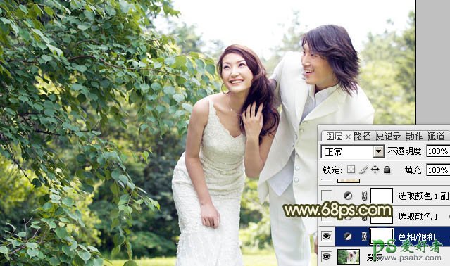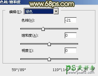 1、打开素材图片,创建色相/饱和度调整图层,选择绿色调整,参数设置如图1,效果如图2。这一步把绿色转为黄绿色。