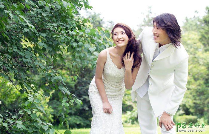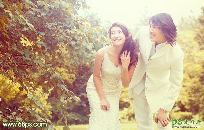 PS婚片调色实例教程,PS调出柔和的淡黄色漂亮情侣外景婚片教程,淡黄色调色方法有很多。可以根据素材图片的颜色构成选择不同的方法。如果画面的颜色比较杂乱用渐变映射或纯色填充调色是最快的。如下面的素材图,颜色比较单一,用调色工具细调也是比较快的。