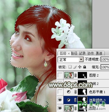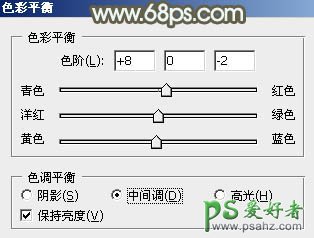 7、调出当前图层蒙版选区,再创建色彩平衡调整图层,对中间调,高光进行调整,参数设置如图17,18,效果如图19。这一步把人物肤色调红润。