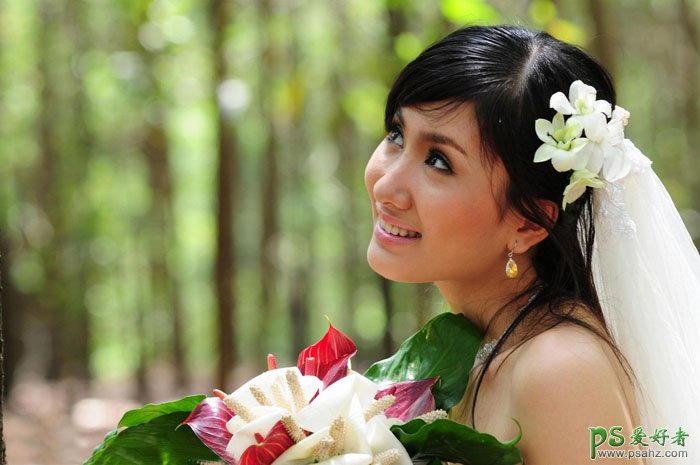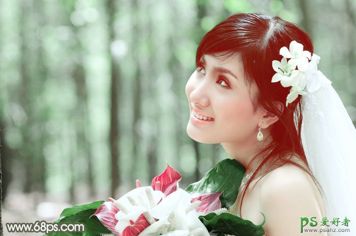 PS婚片后期调色教程实例,PS调色教程:给性感的MM婚片调出柔美的淡绿色,淡绿色也是常用的甜美色。不过图片整体用淡绿色会有点单调,需要在图片的暗部如头发部分加上紫红色补色,同时把人物肤色调红润即可。