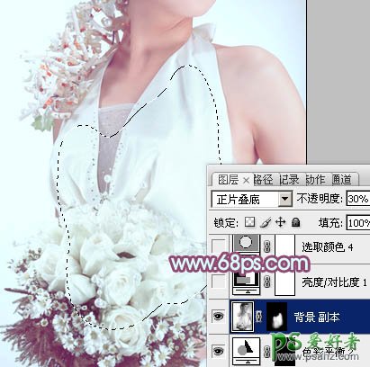 9、把背景图层复制一层,按Ctrl + Shift + ] 置顶,按Ctrl + Shift + U 去色,混合模式改为“正片叠底”,不透明度改为:30%,按住Alt键添加图层蒙版,用白色画笔把下图选区部分涂出来,效果如下图。这一步增加衣服部分的细节。
