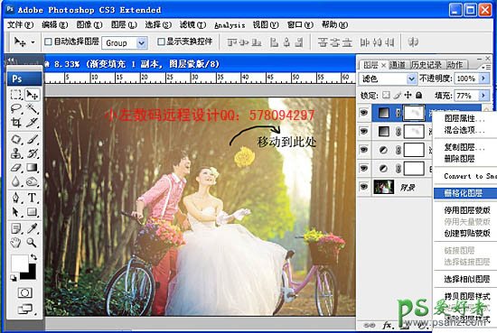 6、鼠标对着渐变填充副本,点鼠标右键,选择“删格化图层”再用“移动工具”移动图层到合适位置。