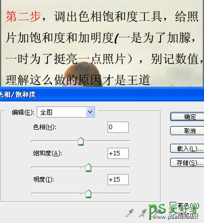 2、调出色相饱和度工具,给照片加饱和度和加明度(一是为了加朦,一时为了挺亮一点照片),别记数值,理解这么做的原因才是王道。