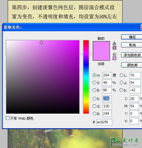 4、创建淡紫色纯色层,图层混合模式设置为变亮,不透明度和填充,均设置为50%左右。