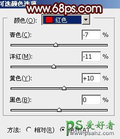 6、创建可选颜色调整图层,对红,黄进行调整,参数设置如图18,19,效果如图20。这一步加强图片的暖色部分。