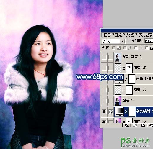 9、创建渐变映射调整图层,参数设置如图14,确定后把图层混合模式改为“柔光”,图层不透明度改为:50%,效果如图15。