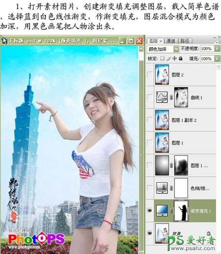 1、打开原图素材,创建渐变映射调整图层,颜色设置为蓝色到白色线性渐变,确定后把图层混合模式改为“颜色加深”,用黑色画笔把人物部分涂出来。