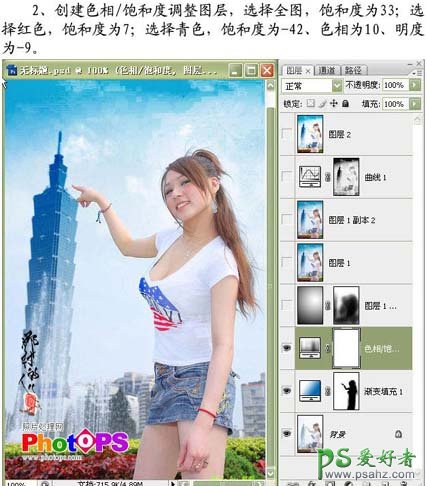 2、创建色相/饱和度调整图层,选择全图,饱和度为:33;红色:饱和度为7;青色:饱和度为:-42,明度为:-9。