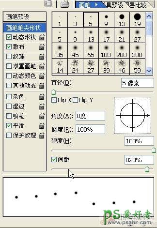 7.现在总体效果已经出来了,现在还存在很多暇癖,我们可以回去修改,最后我们就要做一些画面效果装饰,先新建一层,选画笔工具,在画笔面板中设置一下画笔(如图),先用白色的硬画笔随意绕人物画,然后在用白色软画笔画,白色画好后我们换一种和画面一致的颜色再这样画,这个自己去把握。