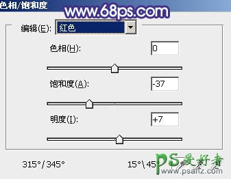 4、创建色相/饱和度调整图层,对红,青进行调整,参数设置如图5,6,效果如图7。这一步主要把图片中的红色减淡。