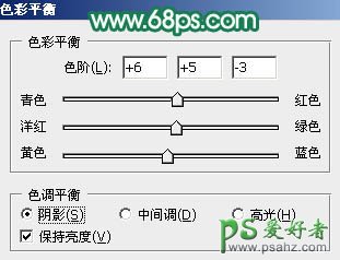 8、创建色彩平衡调整图层,对阴影、中间调、高光进行调整,参数设置如图13 - 15,确定后把蒙版填充黑色,用白色画笔把人物脸部及肤色部分擦出来,效果如图16。这一步把人物肤色调红润。