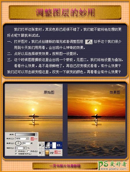 PS图片后期调色实例教程,调色技巧教程实例,PS调色教程学习:巧用渐变叠加快速调整风景图片色彩,本教程主要是介绍使用渐变叠加来改变图片的颜色,只需要绘制一个渐变就可以轻松制作非常漂亮的图片,效果非常简单,用途也非常广。 原图 最终效果 制