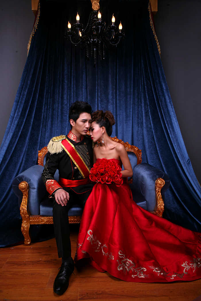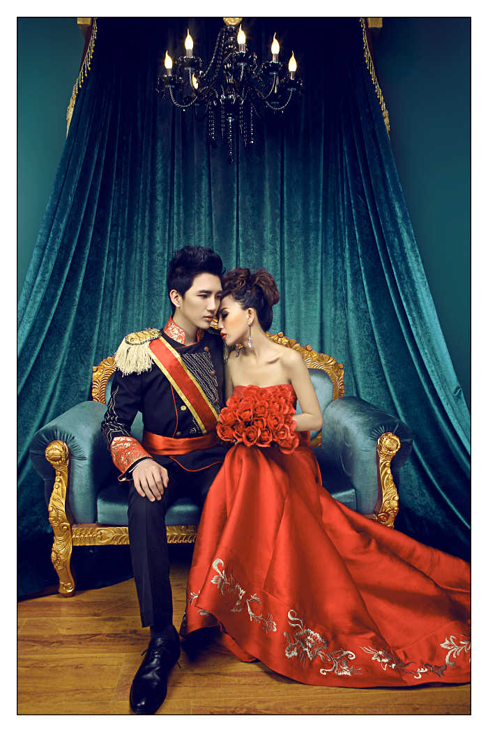 原图分析:第一眼看到摄影师这幅作品有一种王朝宫殿的感觉: 男主角冰冷帅气的模样犹如王子,女主角高贵大方则似公主。 画面很唯美,藏蓝色的布幔、一束鲜红色玫瑰、一把庄重的欧式椅、整体道具搭配完美的结合, 更是这幅作品的画龙点睛之笔。