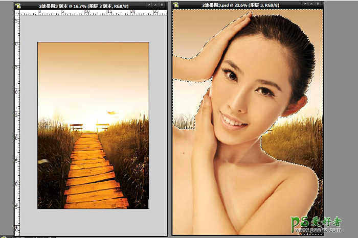 3.用魔棒钢笔等工具把白色背景扣出来将搜集到的秋意浓浓背景按CTRL+G隐藏到背景上去,中间注意头发背景的连接处要精细处理效果才会更真实。