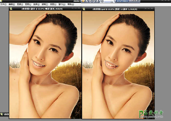 4.用钢笔把人物的牙齿抠出复制一份出来,在将嘴唇扣出来复制出来一份中间复制出来的时候要给2个羽化值哦,要不复制出嘴唇就太生硬了。
