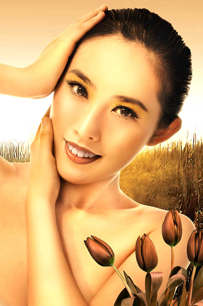 调修思路: 照片本身属于很简洁自然风格,这这里我们进行跳跃适的调修把人物整体调整成阳光照着身上透发出古铜色皮肤在加上一些秋意背景素材橘黄的眼影花朵的衬托表达出一个成熟妩媚温婉气质美丽女孩。