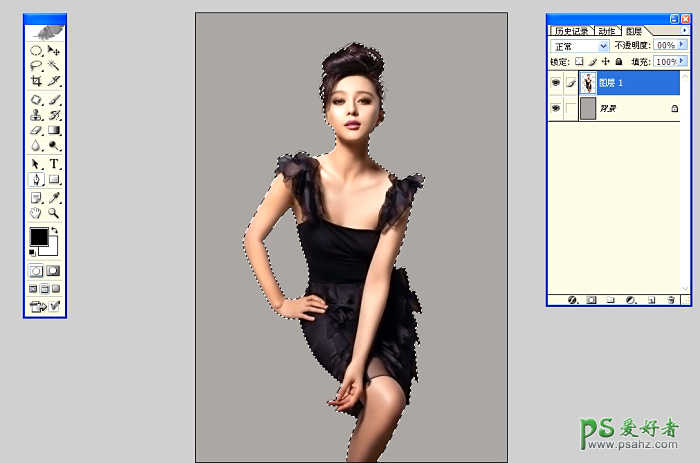 1.用魔棒工具把人物扣出来再用背景橡皮擦擦拭头发的细节处.