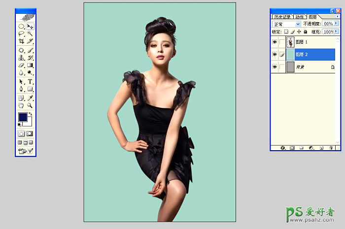 2.新建图层把新建的图层背景调整成淡青色底色,色调一定要掌握的准不然配出的颜色不搭配 效果就好了.