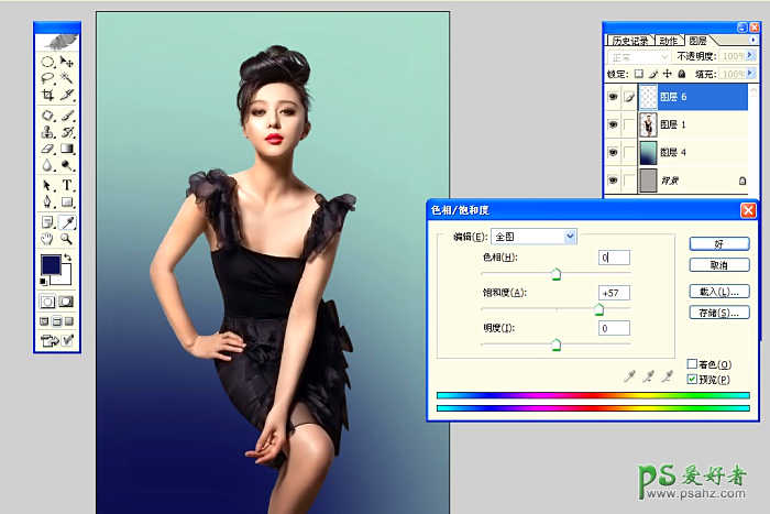 6.选择嘴唇图层 执行色相饱和度饱和度+57 不宜过红