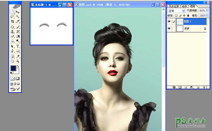 9.把在网上收集的眉毛笔刷拖入图层中调整好大小对眼睛精修美化的添加