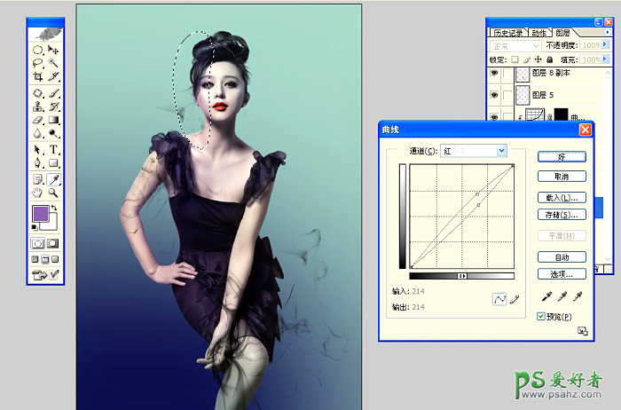 13.建立蒙蔽 用L工具在人物图层脸部选取曲线 提红压暗 制造脸部的淡红色光影